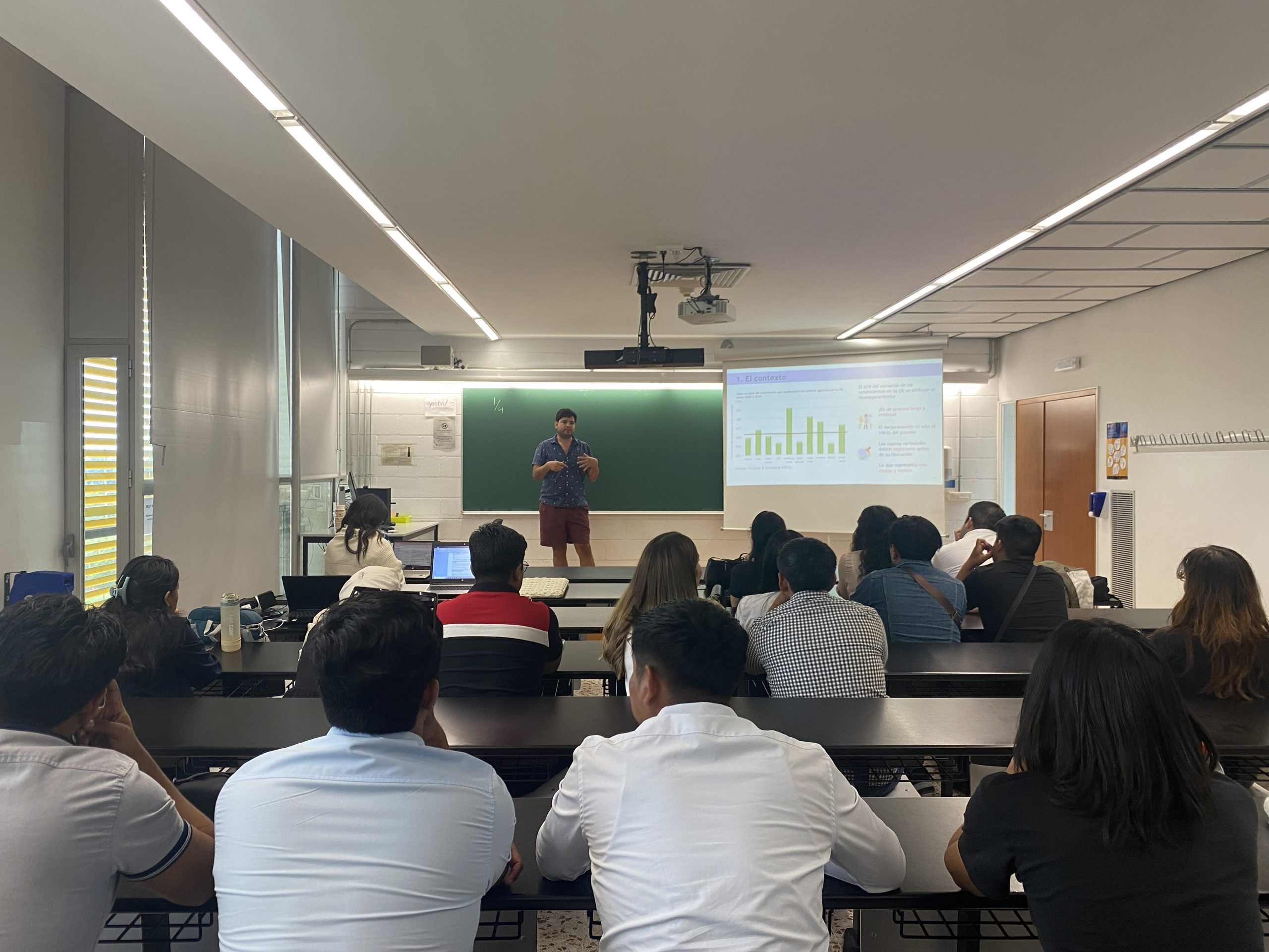 Chema hizo una introducción de CREDA y su tarea, Kenza presentó su trabajo en relación con las dietas y los sistemas de ganadería en el sector porcino, Sergio compartió su estudio sobre el registro de nuevas variedades vegetales y Tianyu Zhang explicó a que nos referimos cuando hablamos sobre el desperdicio alimentario.