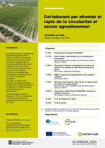 Bajo el título ‘Col·laborant per afrontar el repte de la circularitat al sector agroalimentari’, el evento tendrá lugar el próximo jueves 08 de febrero a las 11 h y será online. Durante el acto se fomentará la colaboración multiactor entre las personas asistentes para impulsar la economía circular dentro del sector agroalimentario.