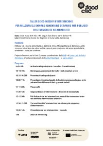 La sesión tendrá lugar el próximo viernes 22 de marzo a las 9.45 h en el Centro Cívico Pati Llimona de Barcelona y tendrá como objetivo la presentación de actuaciones que puedan mejorar los entornos alimenticios de barrios con población en situaciones de vulnerabilidad. Durante el acto se fomentará la colaboración entre las personas inscritas para co-diseñar intervenciones a partir de los resultados obtenidos en los talleres de planificación del pasado mes de febrero.